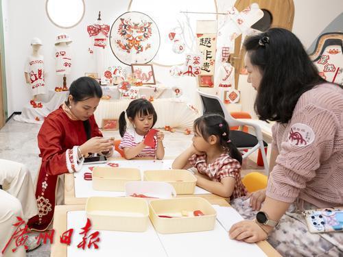剪纸艺术体验区,家长和幼儿在名师指导下进行剪纸艺术创作。