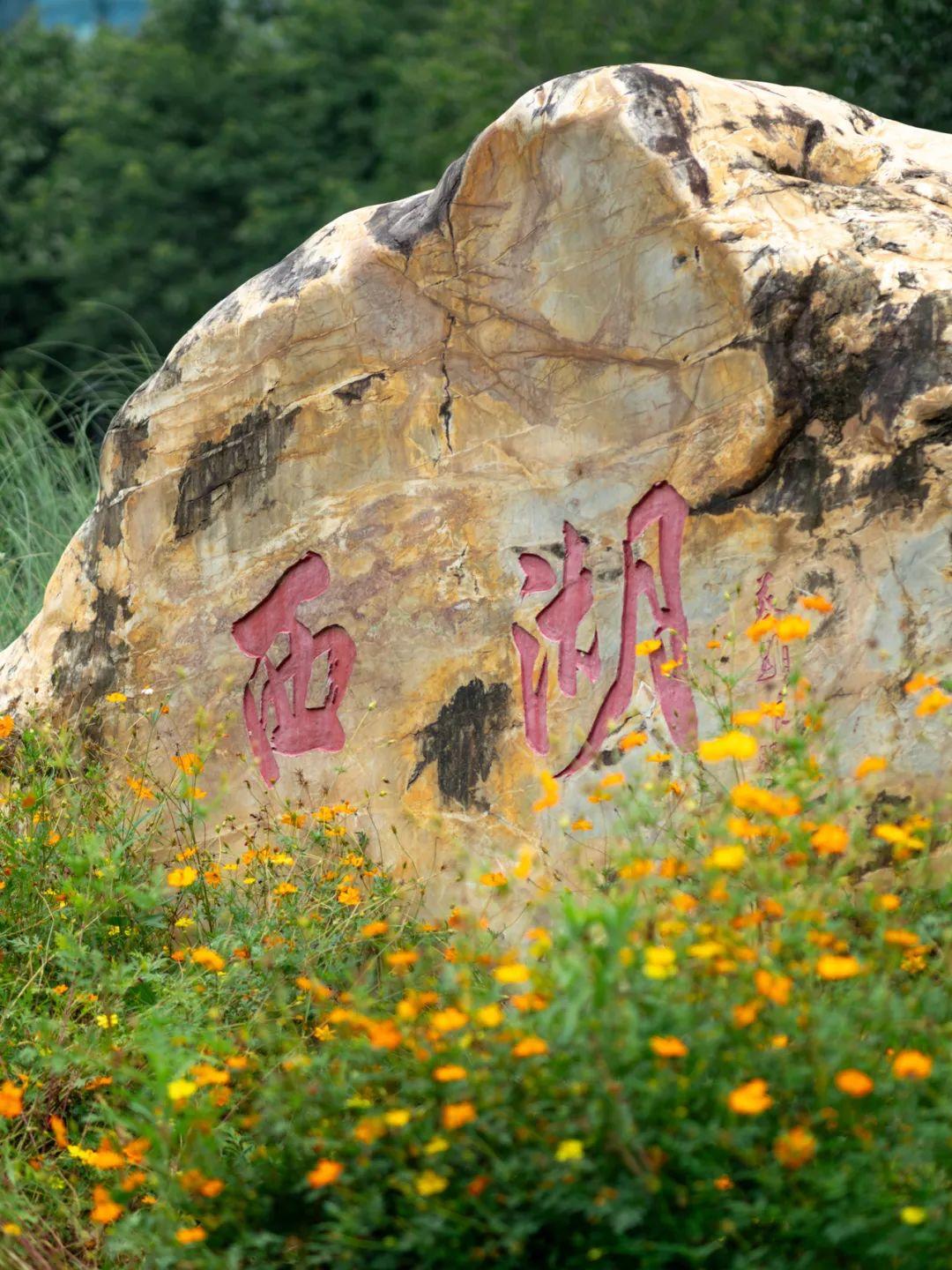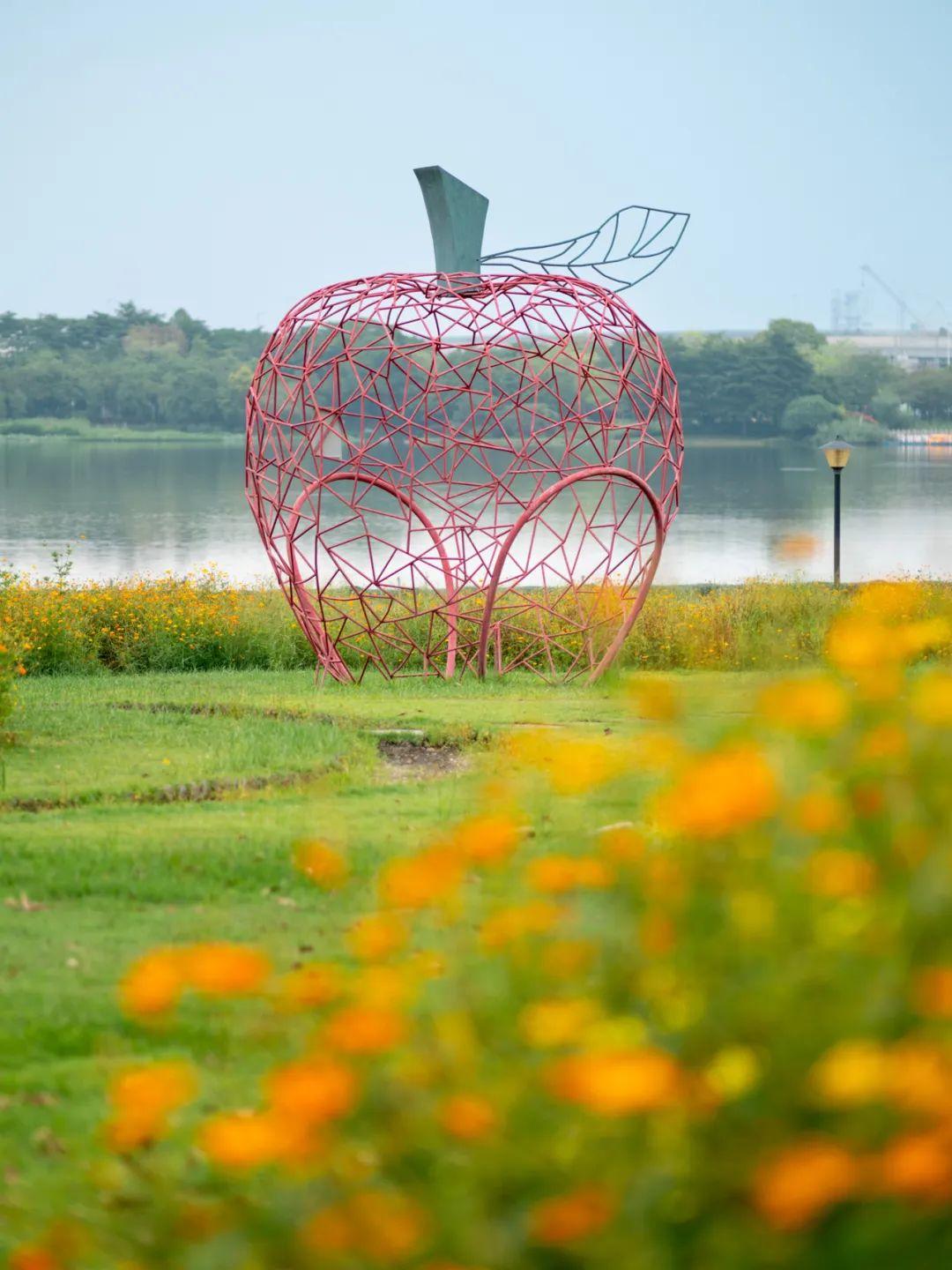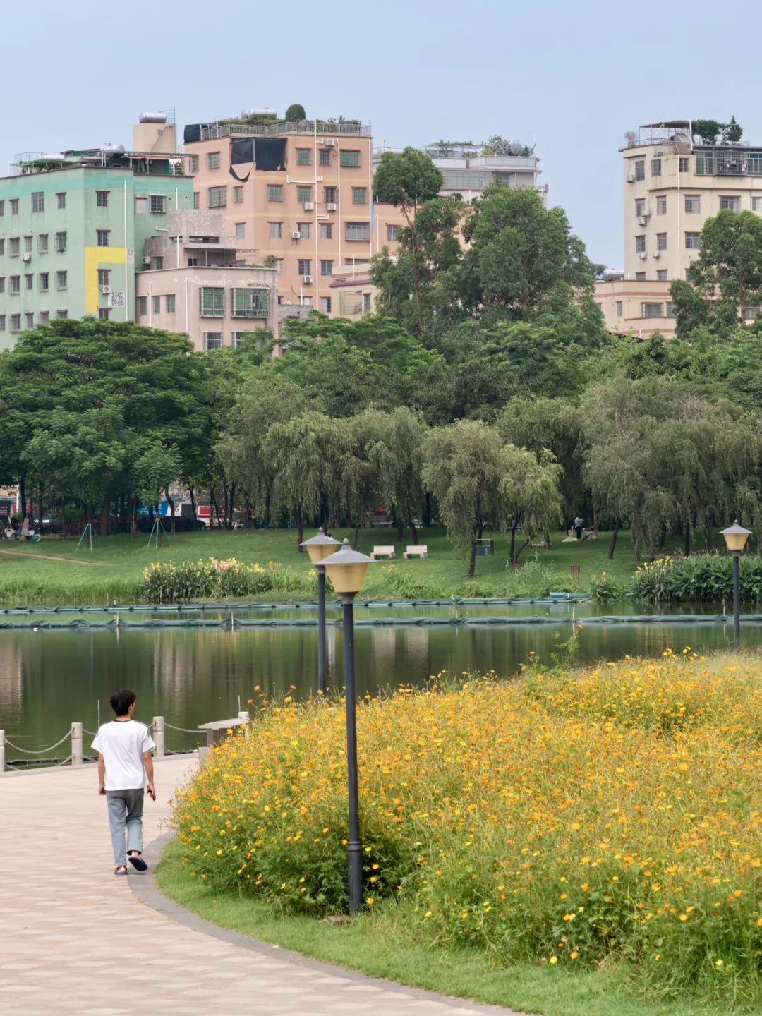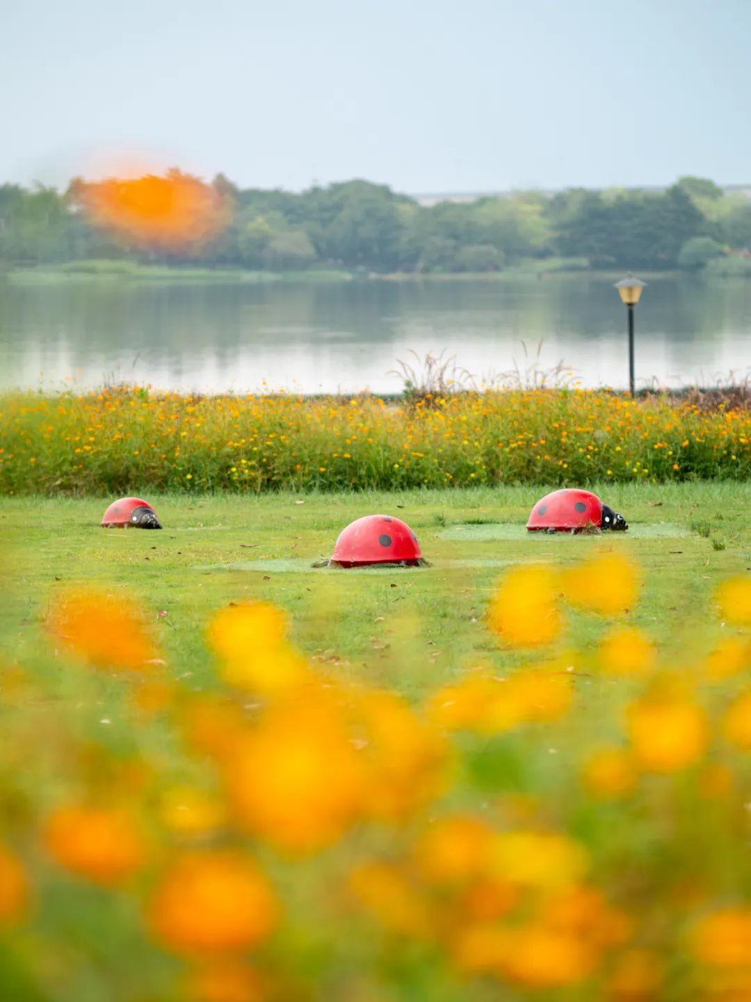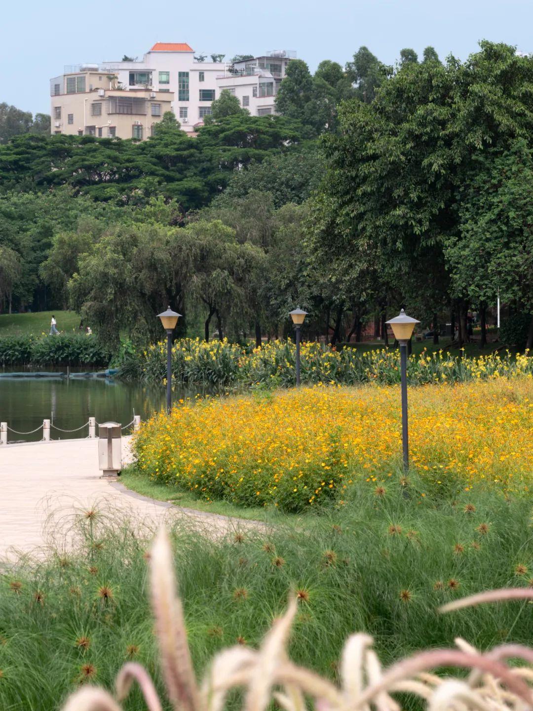 园中栽种了几棵大树,成为这片硫华菊“花海”的视觉中心,大树枝繁叶茂,树下芳草萋萋,花树共舞。 去白云湖畔观赏硫华菊,最佳时段是晨曦与黄昏。傍晚时分晚霞浸染,落日熔金,孩童的追逐嬉戏更添诗意气息。 广州白云湖公园的西湖,是城市里的一处生态绿洲,保留了自然野趣,同时体现了设计师精巧雕琢的智慧,非常适合绿道骑行、亲子漫步、湖畔野餐,是值得常赏的一处花城美景。 广州白云湖公园