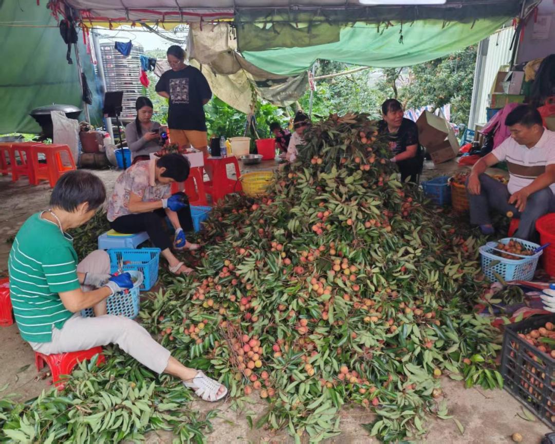 眼下虽然还不是桂味大量上市的时候,但部分阳光较为充足的区域,荔枝已经红透。即使还未红透的荔枝,吃起来也已经非常清甜。打包区,工人也忙乎不已,正娴熟地将品质最好的荔枝挑选出来进行打包,由顺丰快递寄出到全国各地。“采摘、打包各十来个工人,都是就近的村里人。有时候订单比较多,就会招更多的人。现在每天可以卖1000多斤。”何先生说道。
