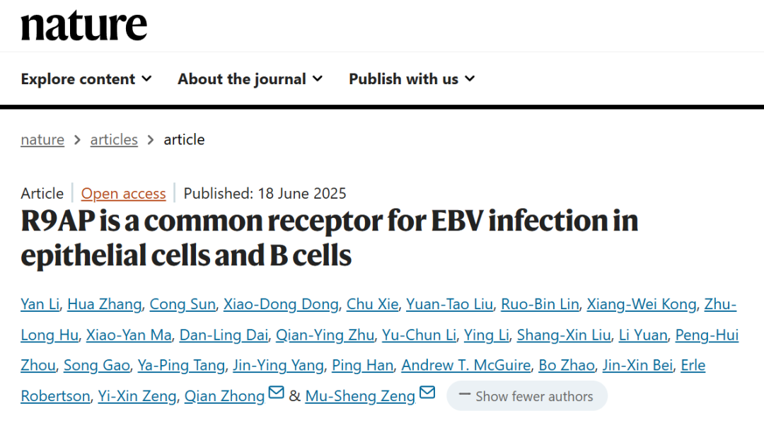 近日,中山大学肿瘤防治中心曾木圣、钟茜教授团队在国际顶级期刊《自然(Nature)》发表了关于EB病毒(EBV)感染机制研究的突破性研究成果。团队历时十余年,首次发现R9AP分子是EBV感染B淋巴细胞和上皮细胞的通用型关键受体,颠覆了B淋巴细胞和上皮细胞分别采用完全不同受体感染EBV的传统认知,为深刻理解EBV感染机制和新型EBV高效疫苗研发提供科学依据。