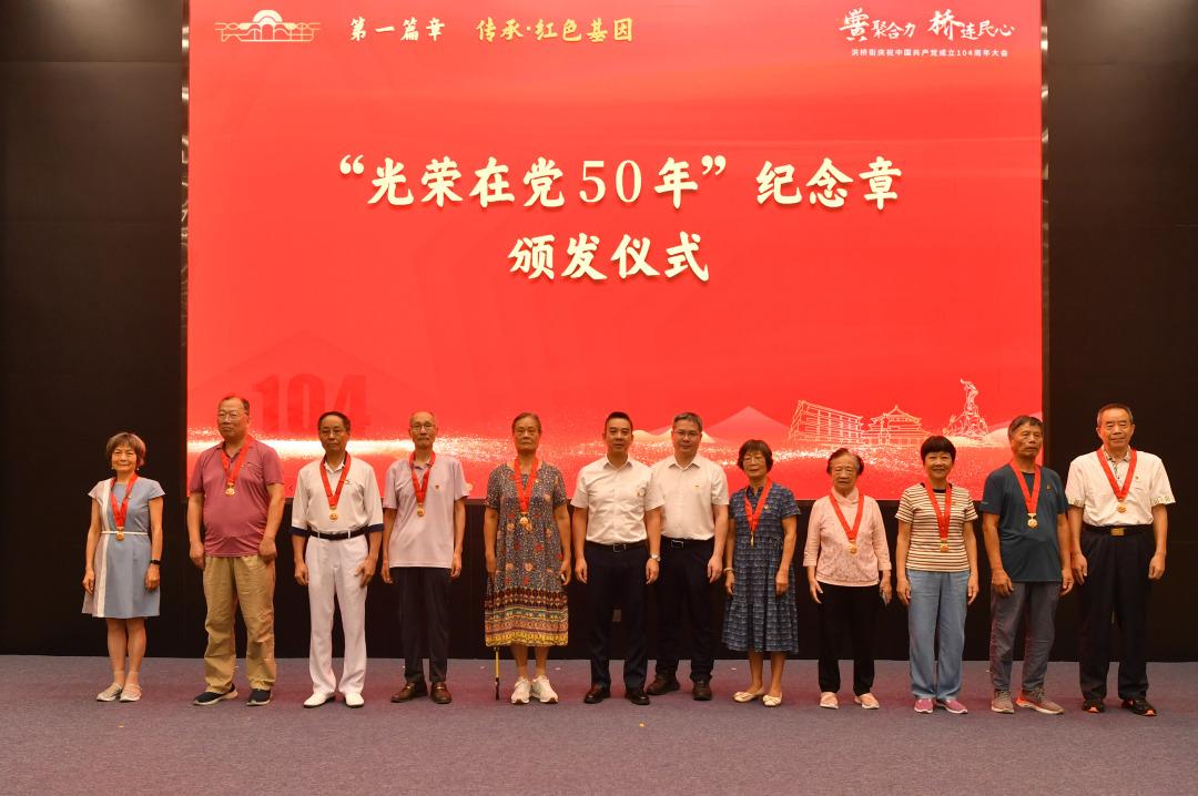 大会分为“传承·红色基因”“聚力·党建领航”“共筑·幸福洪桥”三个篇章。在“传承·红色基因”篇章中,大会为洪桥街10名“光荣在党50年”老党员代表颁发纪念章,向他们为党的事业作出的贡献致以崇高敬意和衷心感谢。现场还特别设置故事分享环节,邀请洪桥街“五老工作室”成员、超50年党龄的“夫妻档”黄春泉、曾碧霞讲述永葆入党初心、参与街区建设的动人故事。“无论是在部队近20年的财会工作岗位,还是转业到地方财税部门或企业,我都以身作则,认真做好本职工作。”“退休以后,我们在洪桥街洪庆坊社区生活安心又舒心,也竭尽所能在社区矛盾调解、文明创建等方面贡献自己的力量。”这对获得“光荣在党50年”纪念章的老党员夫妇,以朴实的话语和真挚的情感,深深鼓舞着在场众人。同时,洪桥街管乐团演奏《抗日歌曲联奏》《没有共产党就没有新中国》,用激昂的旋律重温党的光辉历程、弘扬伟大建党精神。青年党员代表带来《青春向党 强国有我》的铮铮誓言,彰显青春奋进与担当。