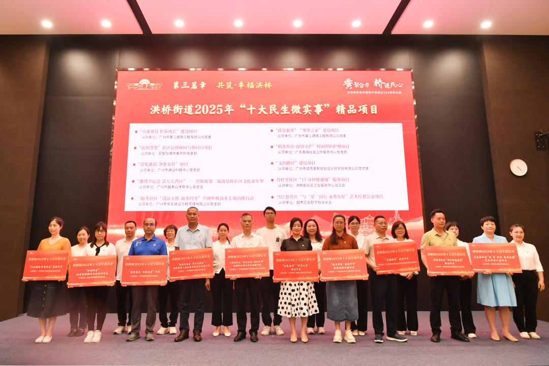 2025年,洪桥街持续推动民生微实事精品项目高质量落地见效,计划实施一批管线老化修缮、公共设施安全改造、空调外机滴水治理等民生微实事项目110余项,广泛动员居民群众深度参与项目征集实施全过程。经过街坊们的积极参与线上投票评选,最终“‘小北驿站 护苗成长’——洪桥街道未成年人保护工作站(小北驿)建设项目”等10个项目成功获评“洪桥街2025年十大民生微实事精品项目”,并在本次大会上正式发布。由广州市第二建筑工程有限公司党委等10家街道党建共建单位对新评选的民生微实事项目进行现场认领,着力解决群众生活需求,为街坊带来更加贴心与多元化的生活体验,共同打造更加宜居、宜业、宜游的幸福洪桥。