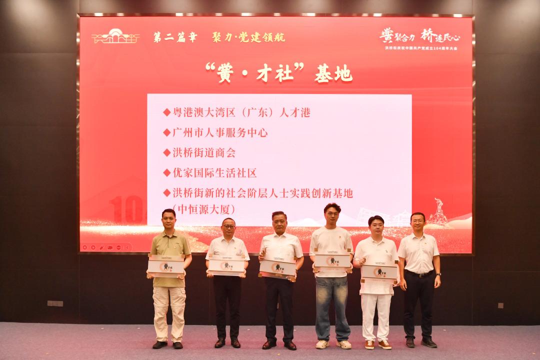 近年来,为提升洪桥街党建引领基层治理能力与水平,凝聚辖区单位党建共建合力,延伸人才服务触角,洪桥街建立“大党工委”工作机制,成立“黉·才社”。这一举措有效整合多方力量,拓展工作维度,为基层治理注入新的活力与效能,助力实现全龄人才与活力街区的“双向奔赴”。大会上,洪桥街相关领导为广州市越秀公园、越秀区小北路小学、广东智环创新科技有限公司、民生医院等4家单位党组织负责同志颁发洪桥街道“大党工委”委员任命书;为粤港澳大湾区(广东)人才港、广州市人事服务中心、洪桥街商会、优家国际生活社区、洪桥街新的社会阶层人士实践创新基地(中恒源大楼)等5个“黉·才社”基地授牌。