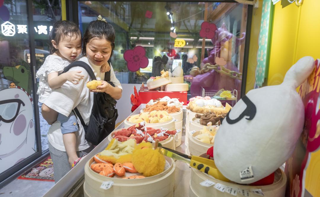 在另一家潮玩店YB集物馆,毛茸茸的叉烧包、干蒸、虾饺等广式茶点公仔被装在蒸笼里,等待顾客选购,就像上茶楼喝早茶一样,而广东人最熟悉的汤料也被做成公仔,躺在“街市”的货筐中,任君组合。“茶楼和街市是广州人气最旺的两个场景,希望给每一个走进来的人带来轻松的情绪互动和浓浓的广府特色。”负责人钱彦君同样非常认可这里的文旅价值,她说,YB集物馆作为一家集合了本土原创设计师IP的潮玩店,时常会被来陈家祠打卡的游客留意和喜爱,这些公仔也成为去往世界各地的广州手信。