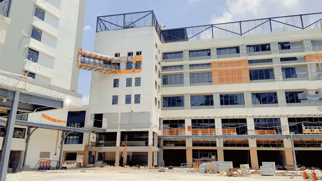 “混搭”是新与旧、传统与现代的混搭。1906科技园由广州卷烟厂二厂闲置的旧厂区改造而来。在改造阶段,项目以微改造、轻介入为原则,为旧建筑注入新活力。“我们保留原本厂房建筑丰富的立面语言,把原有的运货隧道改造为高空连廊,既连接园区内高层建筑,又形成最吸睛的出片场景;在二层外围架立连廊,既承担建筑联通功能,又创造出一层、二层“双首层”商业形态;同时,在水泥灰的基调中加入活力橙,在工业风中融入现代风以及具有地域特色的岭南风。”杨健说。