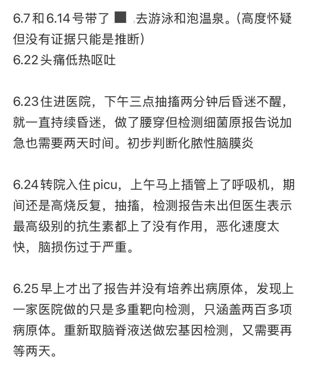 这位家长表示,自己带着5岁女儿小杏(化名)于6月7日和14日去游泳、泡温泉,6月22日出现头痛、低热、呕吐的情况,23日住院后抽搐、昏迷不醒,短短几日内病情急速恶化。