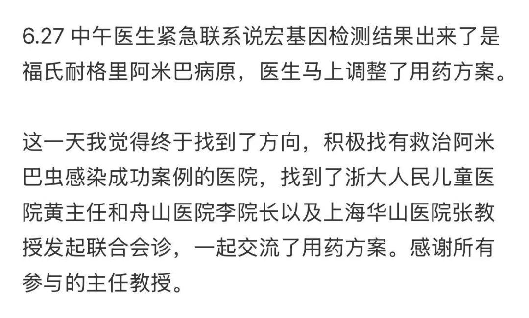 6月27日,小杏被检测出福氏耐格里阿米巴病原感染,目前仍在昏迷中。