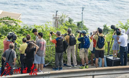 拍摄观看山东舰的香港市民和游客聚集在海边公路上。