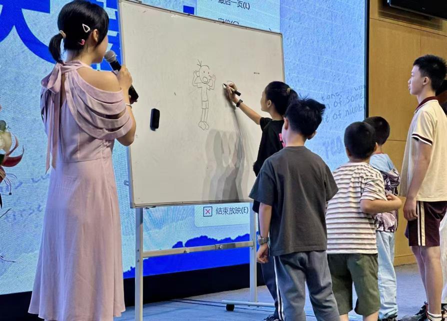 活动以“创作历程揭秘及漫画互动”为主线展开,Phoebe老师向小读者生动地讲述了作者杰夫·金尼在创作《小屁孩日记》时的趣事和困难,将杰夫对写作的热爱和坚持刻苦的精神生动地传递给每一个孩子,悄然在他们心中种下梦想的种子。