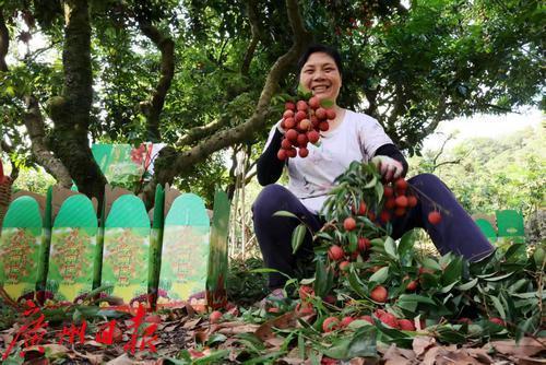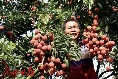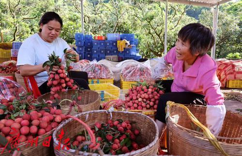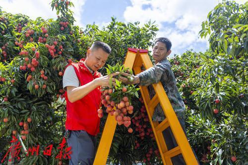 荔枝丰收,三百洞村满园挂红,果农忙采摘。