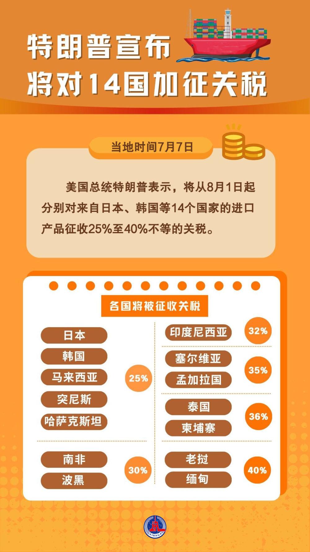 美国总统特朗普7日表示,将从8月1日起分别对来自日本、韩国等14个国家的进口产品征收25%至40%不等的关税。但他当天晚些时候说,这一期限并非“百分百确定”。日本、韩国、南非等国相继作出回应,称关税“令人遗憾”“不合理”,并表示将在期限内继续与美方谈判。