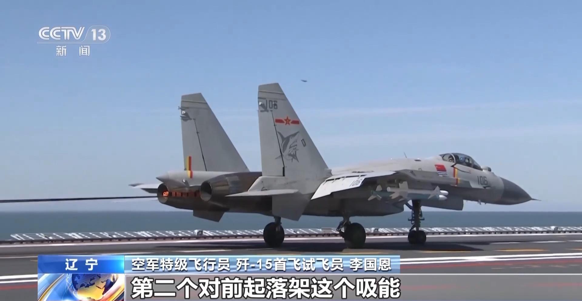 空军特级飞行员、歼-15首飞试飞员 李国恩:因为飞机的姿态是这样的,然后等到尾钩一挂上,前起落架就会砸到甲板上。一是对它强度的考验,二是对前起落架吸能也是一个重要的技术难点,你可以看到起落架非常粗,工业水平整体现在我们也在进步,未来我们希望它结构要细一点、轻一点,飞机越轻,空中的性能越好。