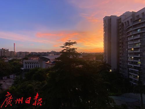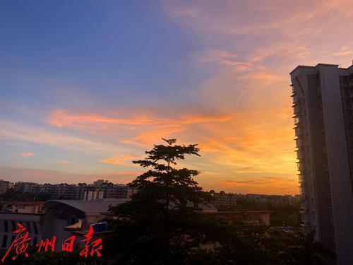 7月8日傍晚7时30分,夕阳将广州西边的天空染成了彩色,薄薄的云雾由红色到橙色过渡,在蓝天的映衬下,像有一支无形的彩笔,描绘出一幅色彩艳丽的油画。