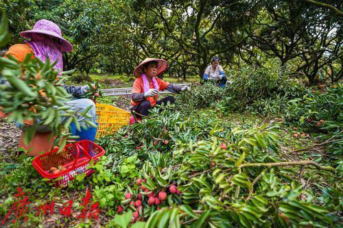 农户将采下的荔枝摘枝去叶准备售卖。