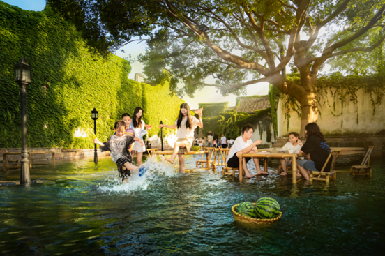 此外,在茶艺街南外场的童玩水乐园内,踩水区、树下广播站、西瓜摊等场景还原三代人的夏日记忆;堤上度假酒店的云河泳池将化身“日落泳池音浪派”,每日17:30至21:00,泳池变身音乐舞台,乐队现场演绎动感旋律;“戏精奇遇夜”活动则以光影与音乐为背景,带来乐队演绎、小丑互动、魔术表演、科学实验……惊喜不断。