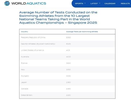 在游泳选手人数最多的10支队伍中,中国队人均接受检查8.8次,其中男子短距离自由泳选手王浩宇13次,覃海洋和杨佩琪各12次,柳雅欣、彭旭玮和孙佳俊各11次。接受检查次数第二多的是中立运动员(俄罗斯),人均8.2次。美国队和澳大利亚队分别是4.13次和4次。此后的排位依次是法国、意大利、匈牙利、日本、加拿大和英国队。