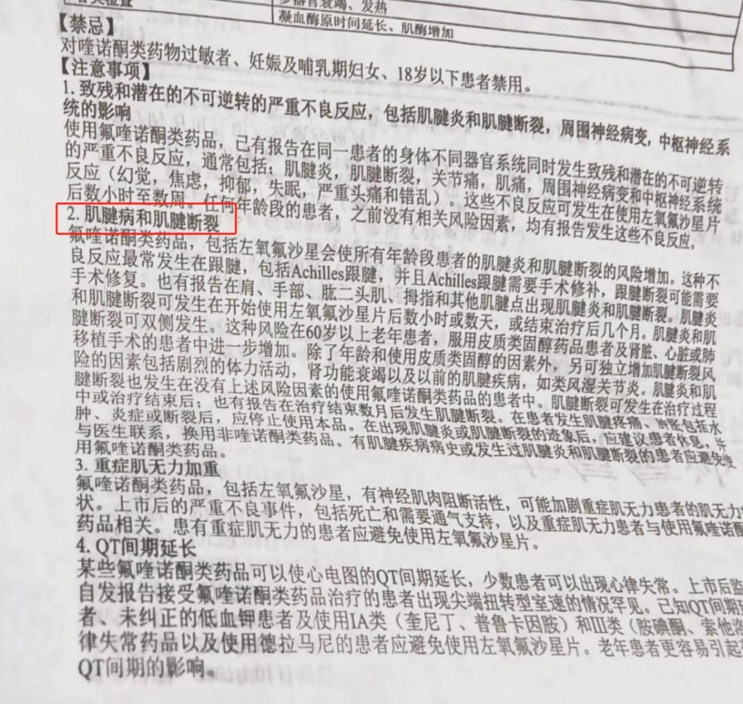 浙江医院骨科中心副主任顾增辉主任医师表示,造成跟腱断裂的可能性是存在的,这在药物的说明书上有明确提到,但个体差异性非常大,跟用药的时间、剂量也息息相关。