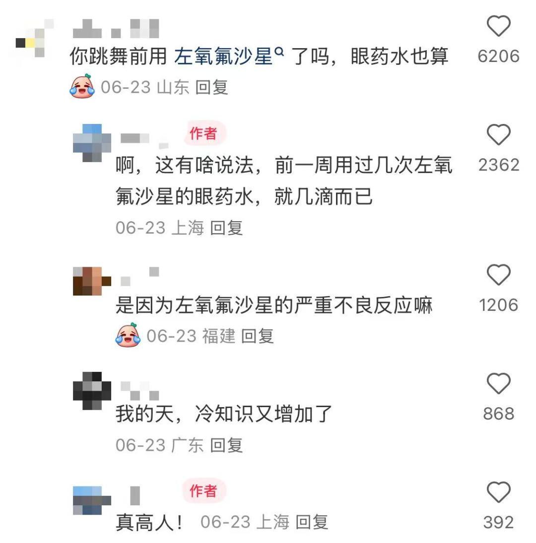起因是有网友分享,最近自己在参加一节Hiphop舞蹈基础课时,“随便一脚把跟腱踩断了”。经评论区网友提醒,意外发现“跟腱断裂可能与使用了左氧氟沙星滴眼液有关”。