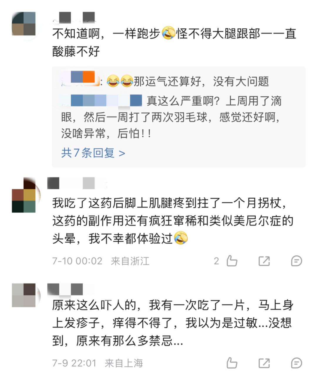 一些网友看后也跟帖表示,自己在用了左氧氟沙星后也出现了腿脚疼的情况,还有网友表示吃药后还有头晕、起疹子等症状。