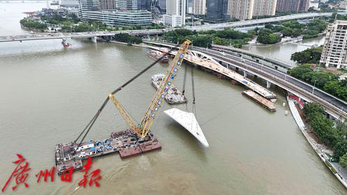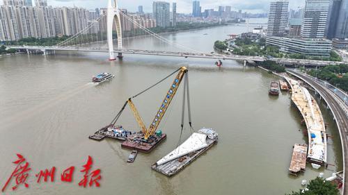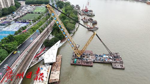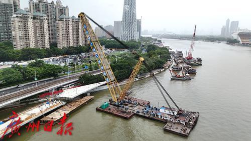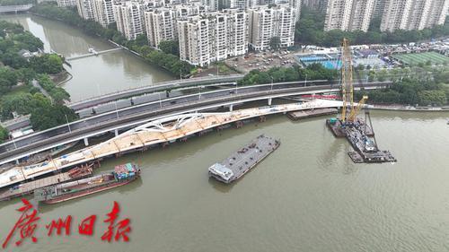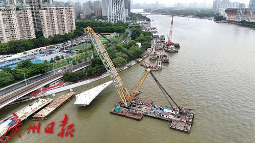 7月11日,随着最后一段钢梁吊装到位,连接广州塔和琶洲西区的黄埔涌步行桥顺利合龙