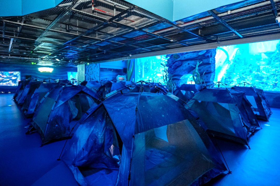 此外,暑假期间,广州海洋馆“深海奇遇夜”夜间露营研学持续火热进行中。家长和小朋友们不仅能沉浸式夜探海洋馆,参与特色科普课堂,还能体验与鱼群共眠的海底露营,在帐篷里看180°海底星空,开启一场难忘的海洋之旅。