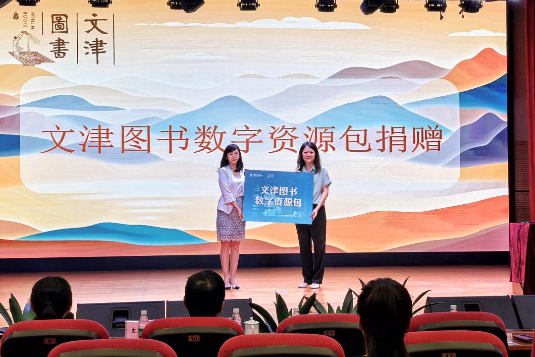 广东省立中山图书馆副馆长徐玉兰(右)接受文津图书数字资源包捐赠