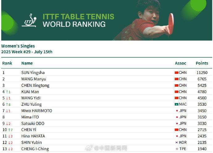 7月15日,世界乒联公布2025年第29周排名。女单方面,孙颖莎11250分保持第一,王曼昱 6765分第二,陈幸同5425分第三,朱雨玲3530分第六,较上周上升8位,陈熠2715分排名第十,较上周上升7位。男单方面,林诗栋8975分保持排名第一,王楚钦8225分排名第二,雨果5400分排名第三。