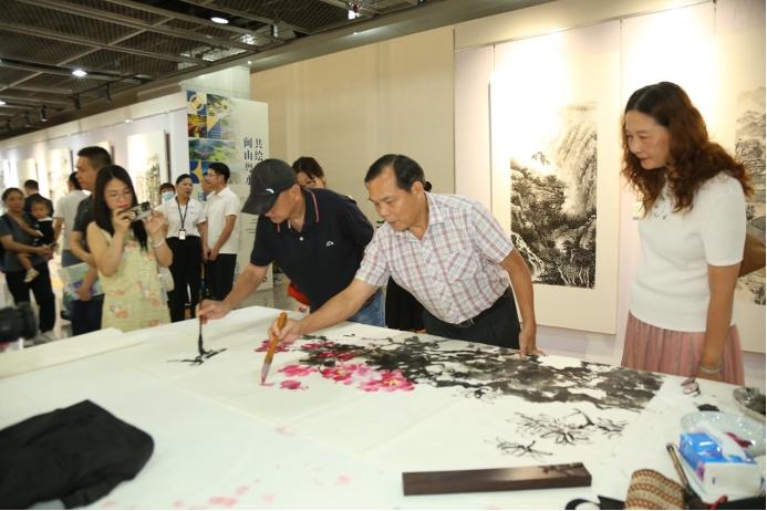 此次文化交流活动同期举办了“闽山粤水 共绘华章书画艺术展”,展览从7月11日持续到7月29日。展览荟萃了两地知名艺术家近150件精品力作,黄埔区艺术家以红色文化、岭南文化、海丝文化、创新文化等为创作源泉,融入黄埔老港、黄埔军校旧址等元素,用笔墨和色彩勾勒出黄埔的历史风貌和现代风采,呈现历史文化名城的丰富内涵。龙岩艺术家则以红色文化、客家民俗、生态山水为核心主题,通过独特的艺术视角和表现手法,展现革命历史、土楼建筑、武夷丹霞等特色题材,彰显闽西文脉的开放性与创新活力。两地艺术家的作品相互辉映,诠释了闽西和岭南文化的多元交融,形成了一场精彩纷呈的文化盛宴。活动现场举办书画笔会,两地艺术家现场挥毫,共绘两地情谊的壮美画卷。