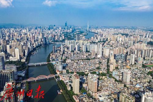 7月15日,广州天气晴朗,气温重归炎热。蓝天白云之下,沐浴在阳光中的西边城区在航拍视角下风景如画。