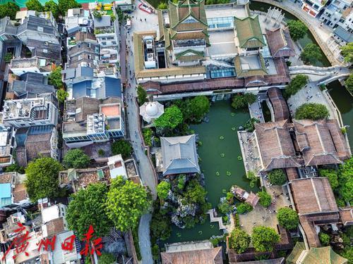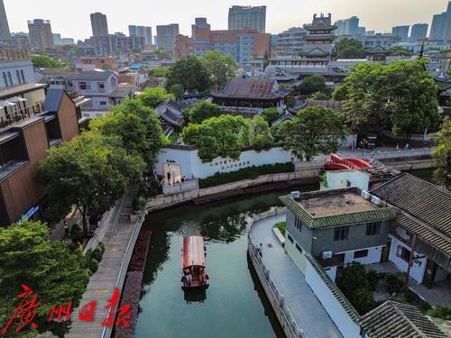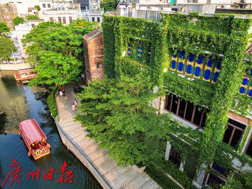 绿意盎然的永庆坊,河涌上游船轻摇,河涌边行人悠悠。