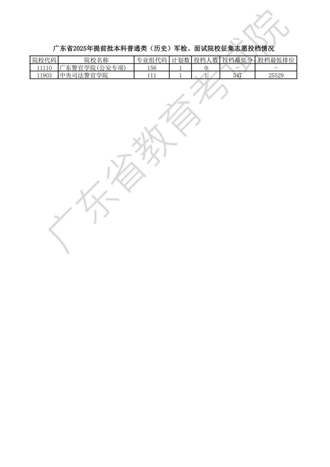 在普通类(历史)军检、面试院校中,广东警官学院(公安专项)156专业组无人成功投档,中央司法警官学院111专业组投档最低分547分,投档最低排位25529,比此前的投档线降低1分。