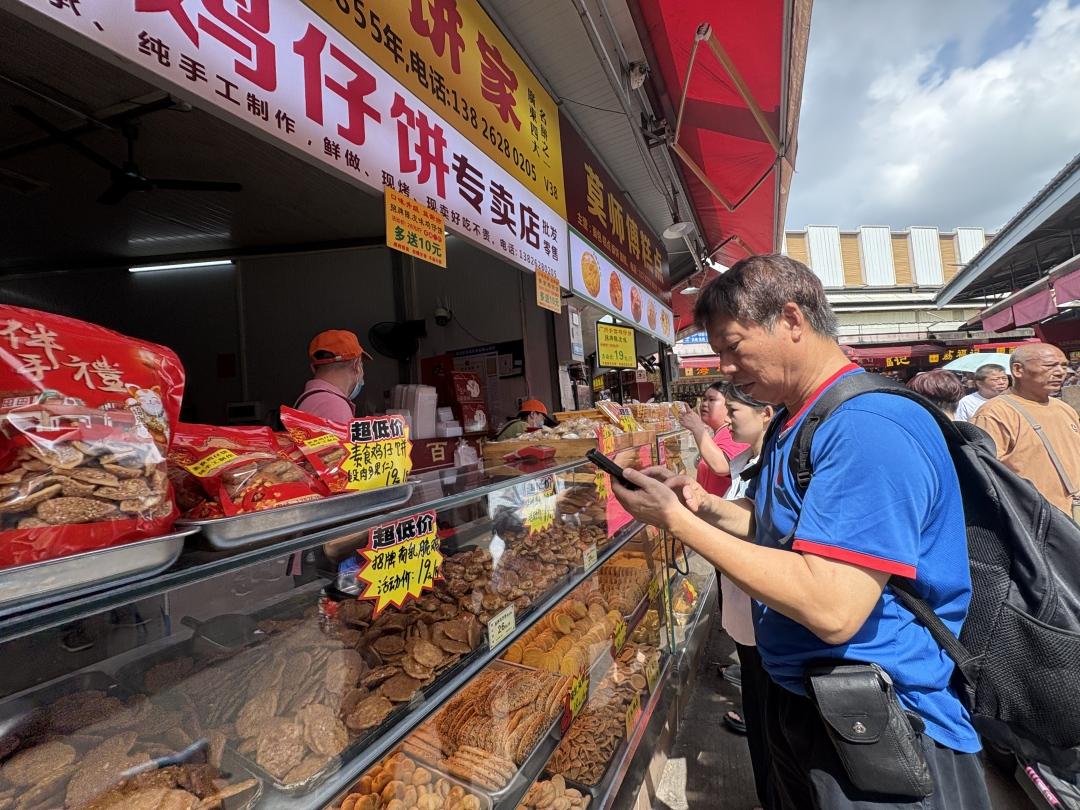 “上个周末卖出了两百斤鸡仔饼。”林记鸡仔饼是市场内人气颇旺的饼铺,档主林荣辉一边忙碌一边说,每到周末,人多得好像过节一样。