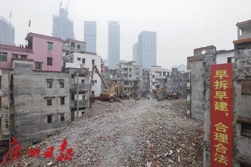 2013年4月,拆迁中的冼村。房子上挂着“早拆早建,合理合法”的口号。