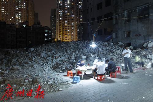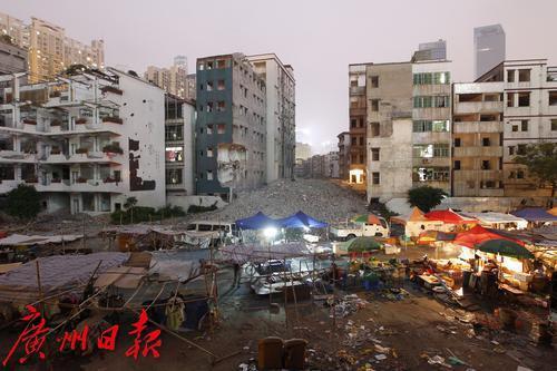 2011年10月,改造中的冼村,村民在废墟边上摆摊。