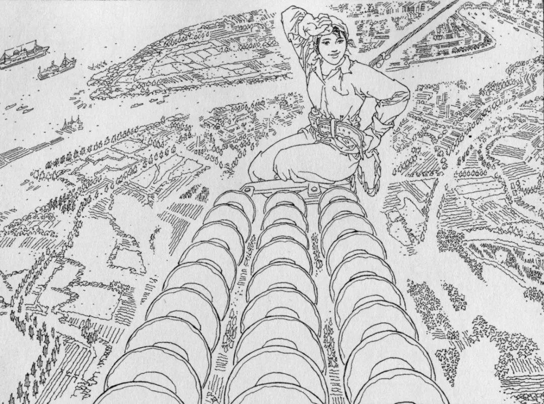 詹忠效在创作《弧光闪闪》过程中,大胆地对传统白描以简约为主的绘画技法进行革新,采用“以繁代简,繁中求简”的方法,结合西方素描与装饰画设计的理念,以疏密有序的线条来表现素描中的明暗面和透视关系。