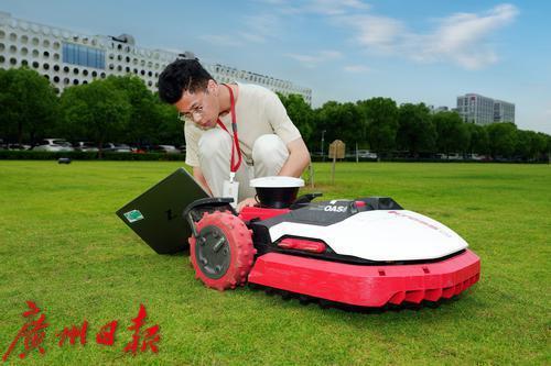 6月20日,宝时得科技(中国)有限公司,技术人员正在草坪上调试一台割草机器人。