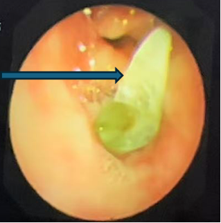 支气管镜检查显示右中间段支气管异物堵塞,镜下看似尖锐,表面大量黄绿色分泌物附着