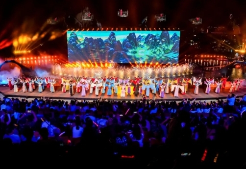 非遗匠魂与现代音浪,共燃岭南夜空“升级后的演出更有历史厚重感,场面震撼壮观,非常值得一看。”今年7月5日,《梦回岭南》2.0版首演结束,现场很多观众都表达了这样的感受。在看台上,年初初演那座40米山体依旧巍峨,暑期又嵌入两块16×10米巨型弧屏,结合大型水幕和威亚、火等特效,让南越古国、岭南武术和采茶、非遗技艺在光影中“活”了起来。