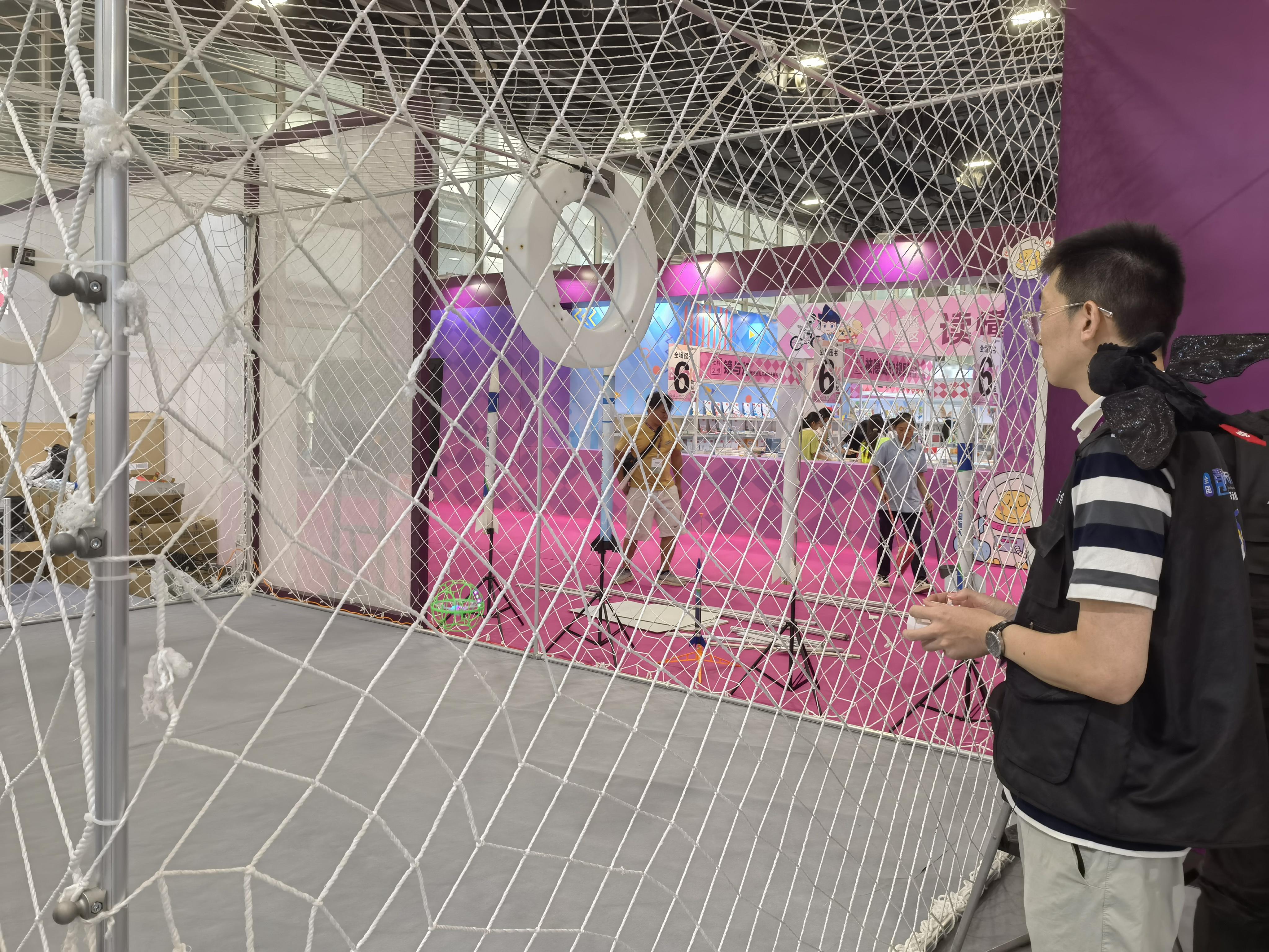 在渡渡潮活馆,足球无人机动态竞技活动同样吸引了不少小朋友的目光。用网围出的三维空间里,两架足球无人机在工作人员的操控下展开攻防对抗,力争穿越圆环得分。小朋友们也在工作人员指导下亲自体验了操控足球无人机的乐趣。