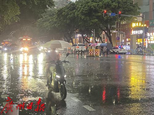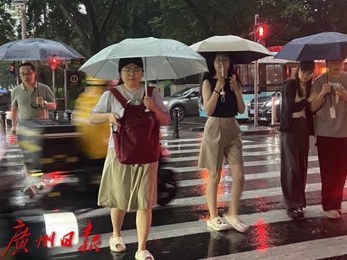 8月14日下午5时15分,广州市越秀区中山二路上人们在雨中前行。
