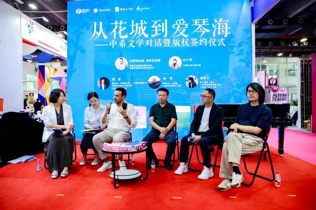 8月15日下午,“从花城到爱琴海——中希文学对话暨版权签约仪式”在欧洲国家馆公共舞台区同样引发热烈反响。花城出版社与希腊瓦克西康出版社就《夜雨寄北》《冬牧场》《深山欲雪》《涉江的青铜》《虚荣广场》五部作品达成希腊语版权合作。这些作品全方位展现了中国当代文学的丰富内涵与独特魅力。
