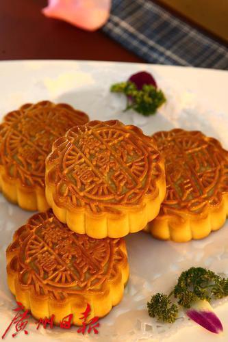 广式月饼以广州地区制作工艺和风味特色为代表的,采用糖浆、花生油、枧水等制成糖浆皮面团,馅料多用莲蓉、椰蓉、椰丝、豆蓉、蛋黄、果仁、糖腌肥猪肉等,重油、重糖,形态边角分明,花纹清晰,表面油润。