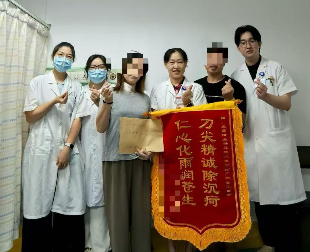 8月18日中国医师节的前一天,李娟顺利出院。离开前,她和丈夫阿强将一面写有“刀尖精诚除沉疴,仁心化雨润苍生”的锦旗送到了王雪峰手中。阳光透过病房的窗户洒在每个人身上,温暖而明亮。
