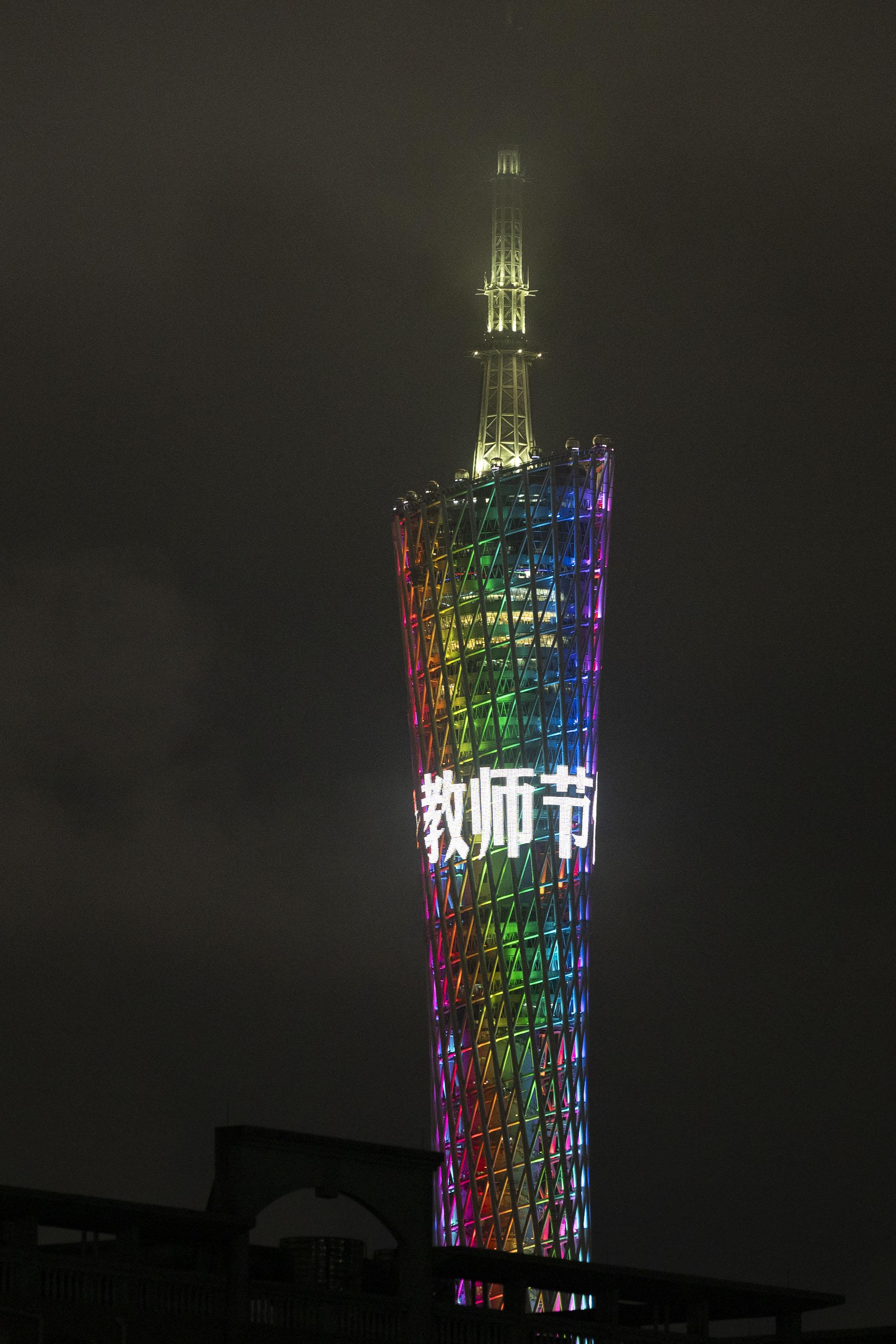 9月10日晚,广州塔还将于19:40-19:45、20:10-20:15、20:20-20:25、20:50-20:55等时段为广大教师亮起祝福语。