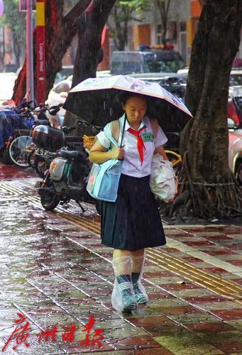 9月8日早晨,今年第16号台风“塔巴”逼近,广州多区暴雨或雷雨大风预警生效,天河区龙口中路,学生们在上学路上。