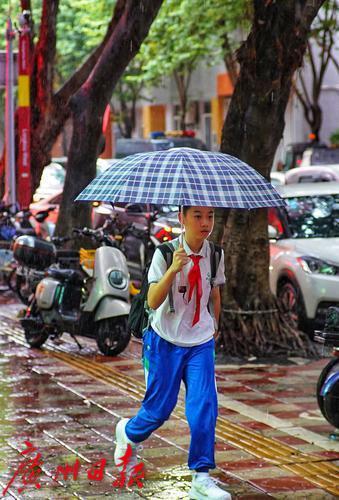 9月8日早晨,今年第16号台风“塔巴”带来雨水,广州多区暴雨或雷雨大风预警生效,天河区龙口东路,八点临近,学生们仍在上学路上。