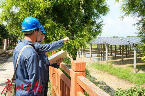 广州增城供电局工作人员为元洲村三峡移民光伏项目开展检查。