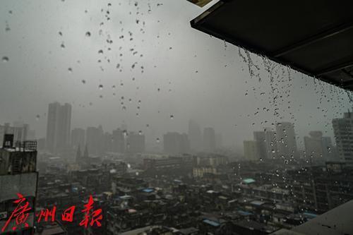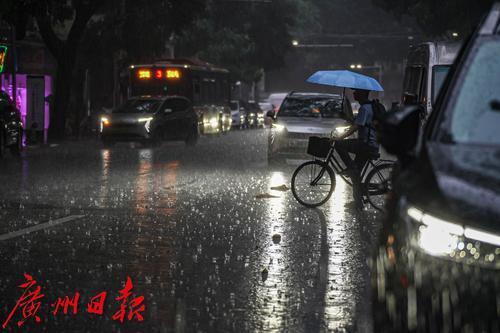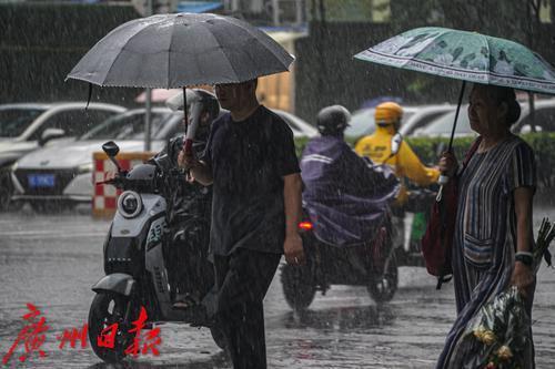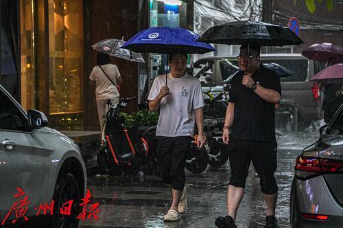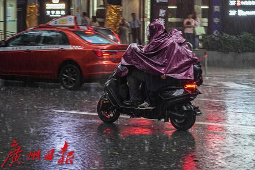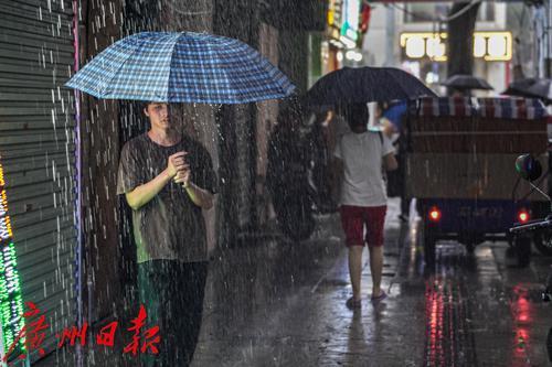 9月10日,广州上午晴朗,午后2时左右雷雨大风袭来,乌云密布。在越秀区,雨势很大,哪怕是下午,雨中行驶的车也得打开车灯。下午出行的市民,或在骑楼下躲雨,或在雨中前行。