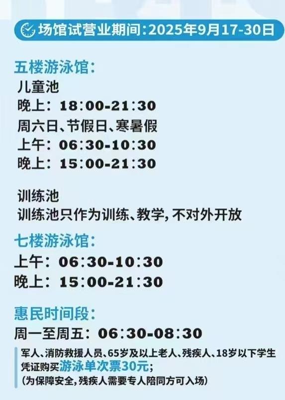 记者了解到,该游泳馆试营业期间(2025年9月17-30日)收费为成人单次票48元/人,军人、消防救援人员、65岁及以上老人、残疾人、18岁以下学生凭证购买单次票30元/人。