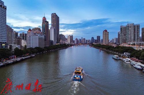 傍晚的长堤一带。入夜,灯光亮起,一艘珠江夜游渡轮在珠江上行驶。